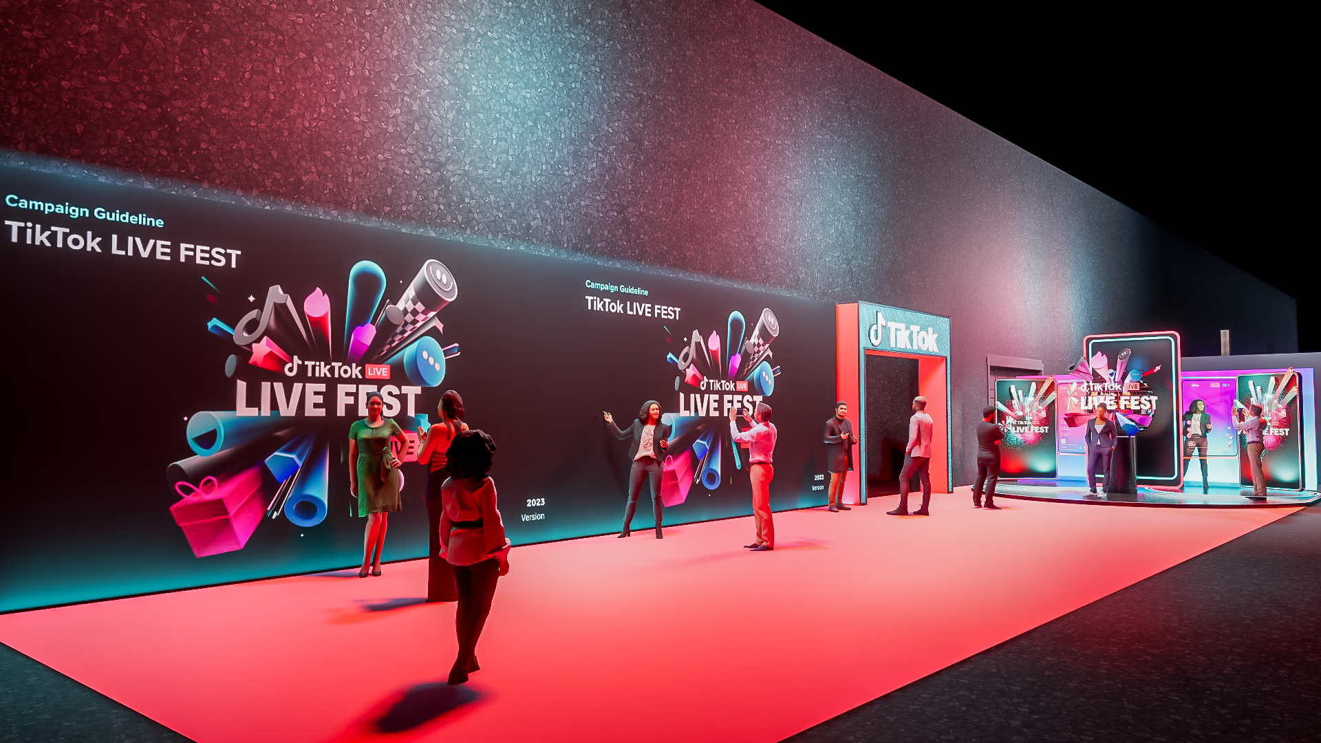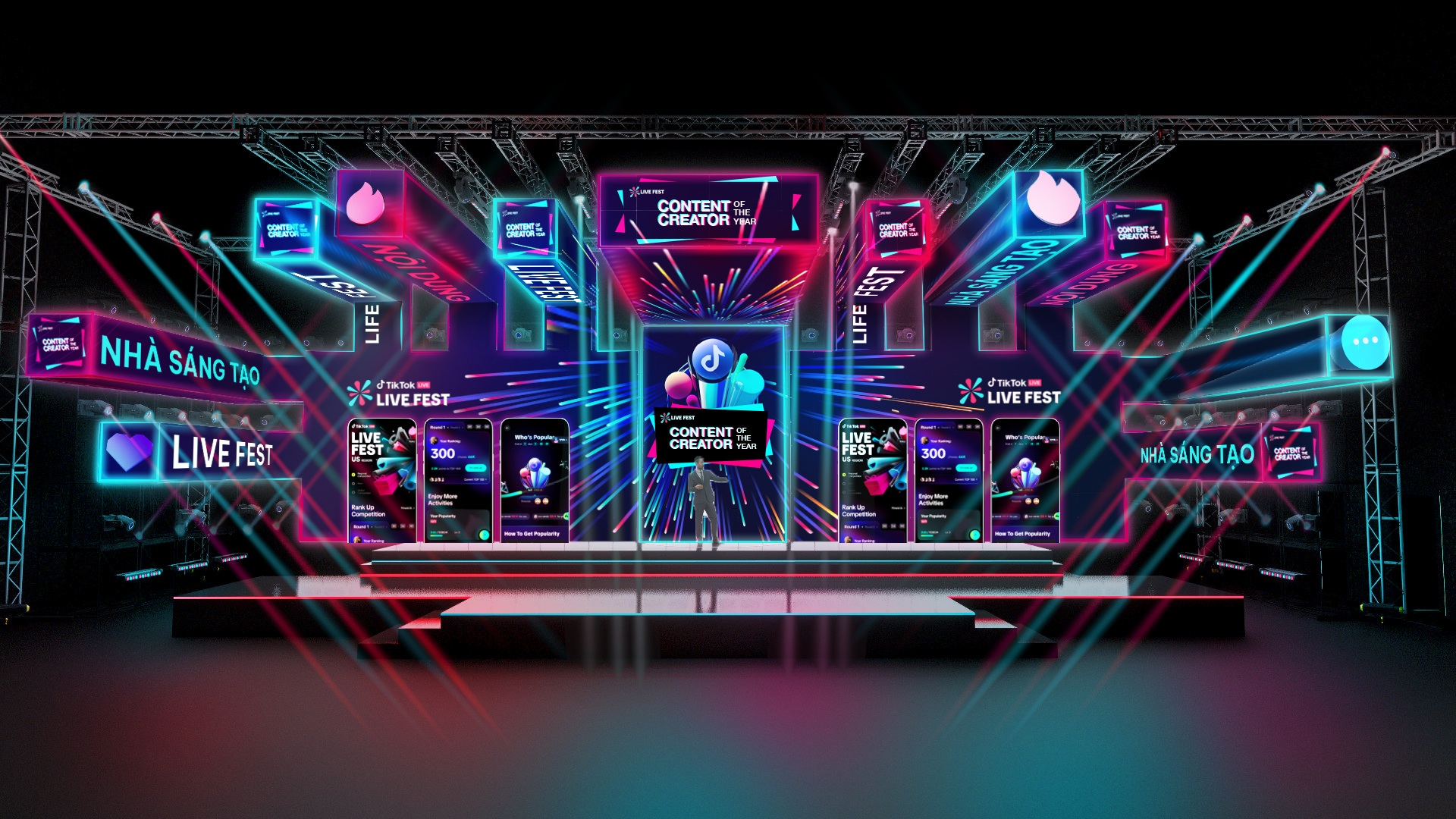 Project:E chịu trách nhiệm thiết kế khu vực bên ngoài và sân khấu chính cho sự kiện TikTok Live Fest, tích hợp hiệu ứng tương tác, hệ thống LED, và công nghệ giám sát 3D. Sự kết hợp này giúp chuyển đổi hoàn hảo từ bản thiết kế sang thực tế, mang lại trải nghiệm sống động và đẳng cấp cho người tham dự.