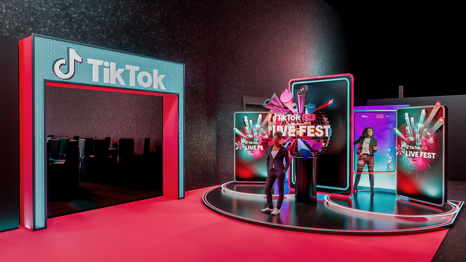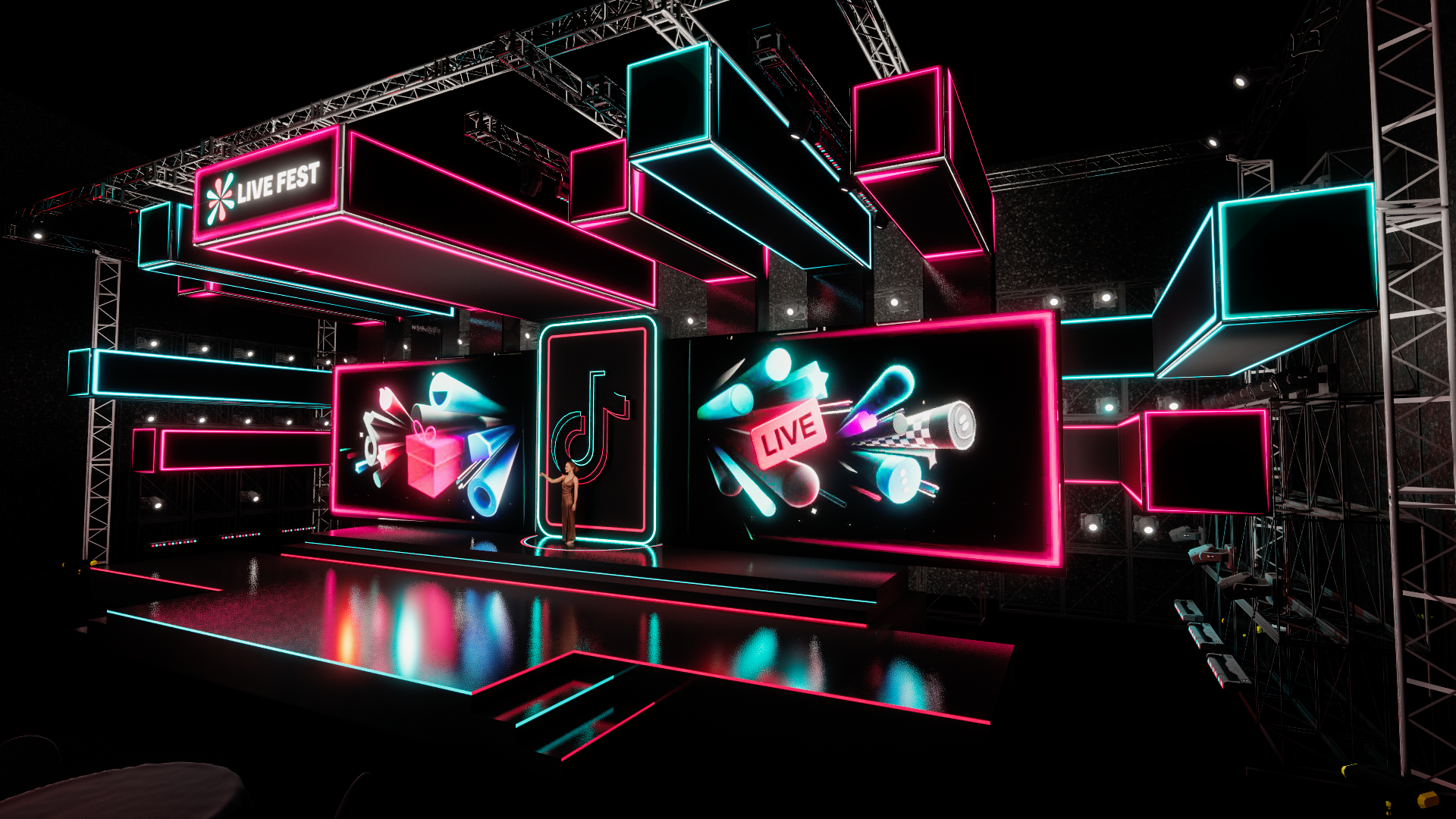 Project:E is responsible for designing the exterior and main stage for TikTok Live Fest, incorporating interactive effects, LED systems, and 3D monitoring technology. This combination ensures a seamless transition from concept to reality, delivering a dynamic and high-quality experience for attendees.